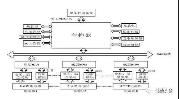 動(dòng)力電池管理系統(tǒng),只有一層集中式或者兩分布式,基本不會(huì)出現(xiàn)三層的情況。小型車主要應(yīng)用一層集中式電池管理系統(tǒng)。兩層的分布式動(dòng)力電池管理系統(tǒng),如下圖所示。