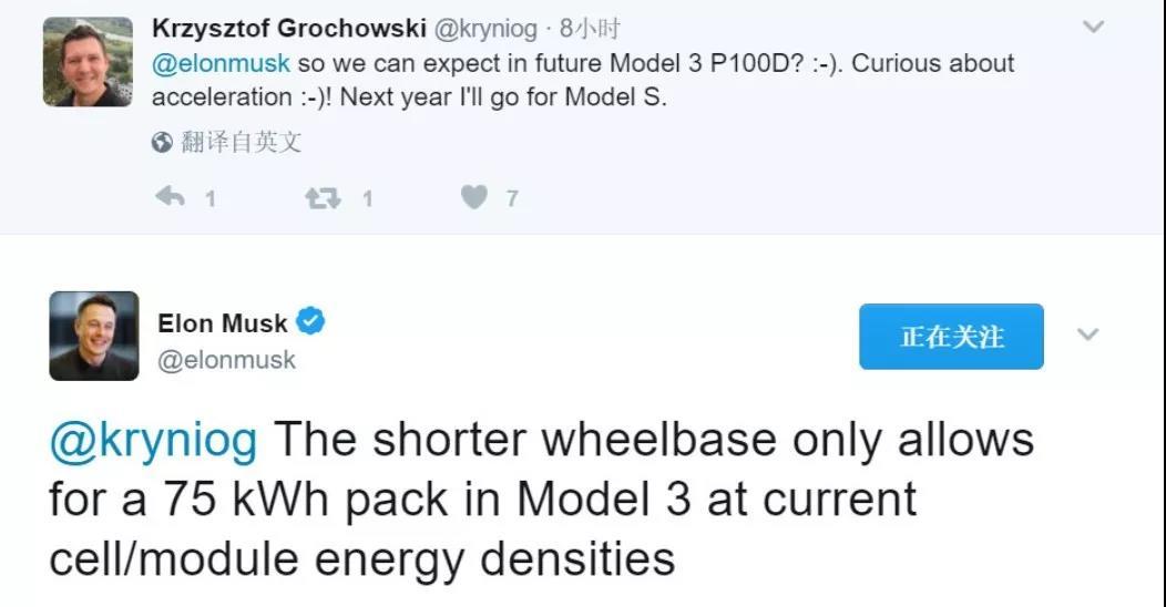 這條 Twitter 發(fā)布于 2017 年 3 月 24 日,而實際電池規(guī)格達到 78 kWh 是 8 月初被扒出來的。所以一種可能是 Twitter 發(fā)布后 Elon 繼續(xù)對工程制造團隊施壓,在量產(chǎn)前的最后關(guān)頭大力出奇跡,成功多塞了幾度電進去;不過我更愿意相信,是 Elon 考慮到 78 kWh 這個規(guī)格已經(jīng)高于 Model S 75D 的電池規(guī)格,避免 Model 3 影響后者的銷售 & 被 Model S 75D 車主眼中的怒火灼傷,特斯拉選擇宣傳上主動減配。