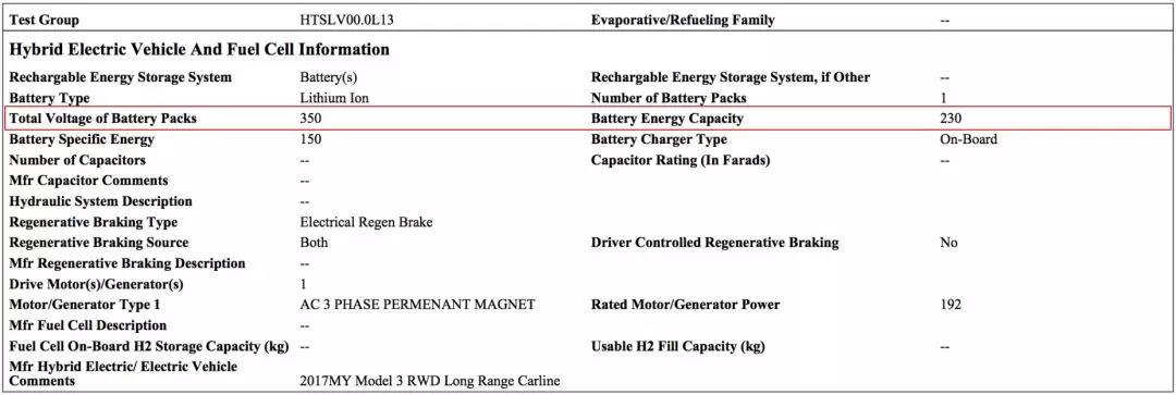 我一度以為,Model 3 的長續(xù)航電池組是 75 kWh。但后來美國環(huán)境保護署(EPA)的文件顯示,長續(xù)航車型的總電壓為 350 V、電池容量為 230 Ah,這么一算電池組規(guī)格達到了 80.5 kWh。