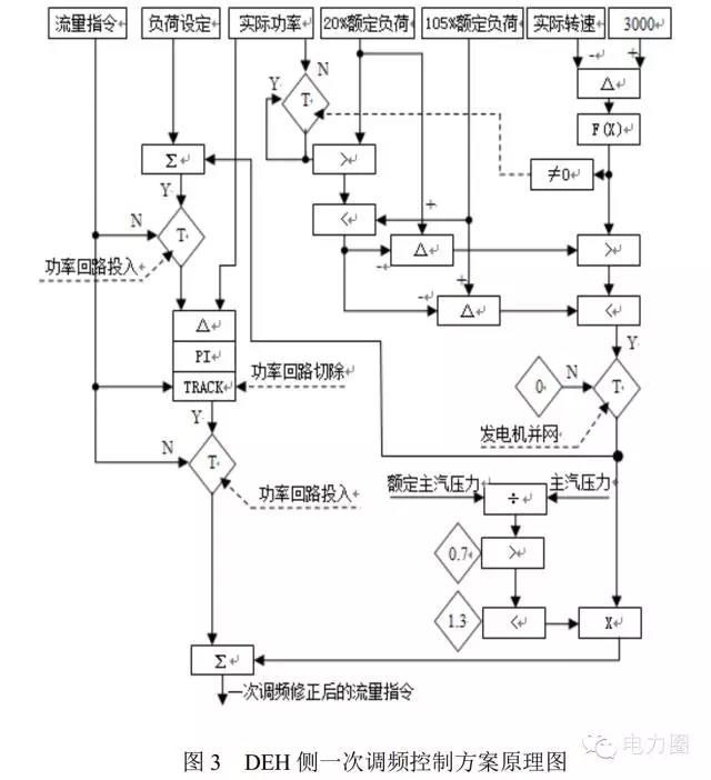 在我國電網(wǎng)額定頻率為 50Hz,汽輪機額定轉(zhuǎn)速為 3000rpm,額定頻率與實際頻率差值(有時額定轉(zhuǎn)速與汽輪機實際轉(zhuǎn)速的差值代替頻率差值)經(jīng)函數(shù)變換后生成一次調(diào)頻補償因子,一次調(diào)頻功能投入, 直接與功率或流量信號疊加,控制汽輪機的調(diào)門開度,一次調(diào)頻切除時,調(diào)頻補償因子系數(shù)為零,不參與系統(tǒng)控制。