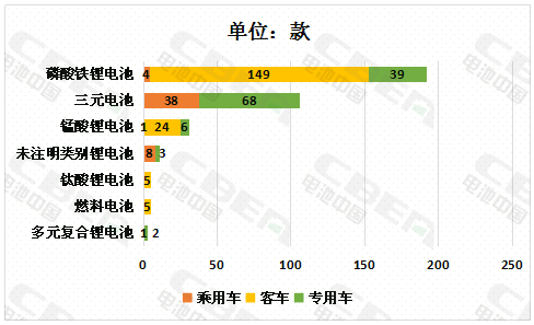 從配套電池類型來看,本批推薦目錄353款車型配套電池類型以磷酸鐵鋰電池和三元電池為主,配套款數(shù)分別為192款和106款,占比分別為54%和30%。其它電池類別配套款數(shù)分別為:錳酸鋰電池配套31款、燃料電池和鈦酸鋰電池分別配套5款、多元復(fù)合鋰電池配套3款和未注明類別鋰電池配套有11款。