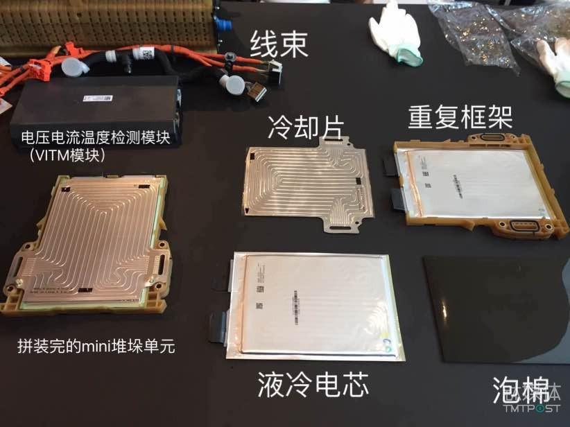 百余個(gè)電芯分為兩組,每組52片。每?jī)善娦窘M成一個(gè) mini 堆垛單元,并通過流水線焊接在一起形成一組模塊。電芯與電芯之間由鋁制冷卻片隔開,冷卻液通過注水口注入,填充冷卻片上的“毛細(xì)管”,循環(huán)流動(dòng),控制整個(gè)電池包的熱量,使整車工作溫度范圍寬達(dá)-30度至55攝氏度。兩組模塊由線束接入電壓電流溫度檢測(cè)模塊(VITM模塊),也就是上述視頻中的“黑匣子”——這一模塊也就是整個(gè)動(dòng)力電池包的“大腦”。