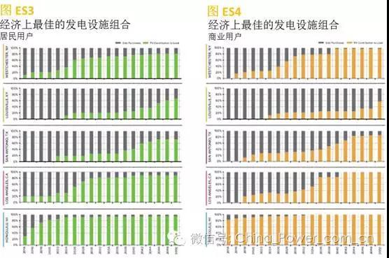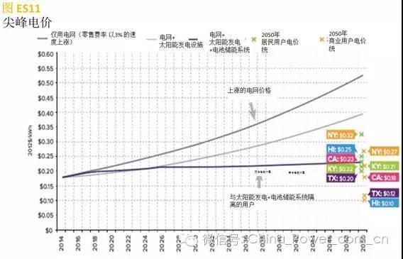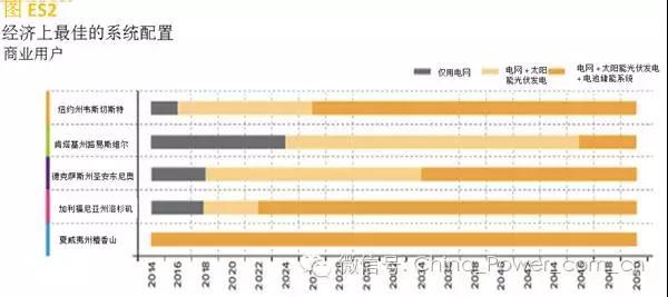 我們的分析有幾項重大發(fā)現(xiàn):太陽能發(fā)電+電池儲能系統(tǒng)能快速地實現(xiàn)成本效益。從用戶的角度看,經(jīng)濟性最優(yōu)的系統(tǒng)配置將隨著時間推移而產(chǎn)生變化,短期來看是僅依賴電網(wǎng)的模式,逐漸會發(fā)展成為電網(wǎng)+太陽能發(fā)電的模式,長期來看最優(yōu)的系統(tǒng)將是電網(wǎng)+太陽能發(fā)電+電池儲能系統(tǒng)模式。與我們在《脫離大電網(wǎng)的經(jīng)濟效益》報告中利用模型分析的無電網(wǎng)太陽能發(fā)電+電池儲能系統(tǒng)實現(xiàn)經(jīng)濟性平價的日期相比,本報告中的聯(lián)網(wǎng)系統(tǒng)實現(xiàn)經(jīng)濟效益的時間會提前很多,而且電力公司將在其主要資產(chǎn)的經(jīng)濟年限及成本回收期之內(nèi),損失大量用電負荷。僅依賴太陽能發(fā)電設施的系統(tǒng)容量較小,今天已經(jīng)在我們分析的五個地區(qū)中的三個地區(qū)實現(xiàn)了經(jīng)濟效益,十年之內(nèi)會在所有地區(qū)實現(xiàn)經(jīng)濟效益。新用戶將發(fā)現(xiàn),太陽能發(fā)電+電池儲能系統(tǒng)的配置在未來10至15年內(nèi)會在上述五個地區(qū)中的三個地區(qū)實現(xiàn)經(jīng)濟效益。