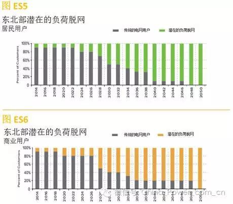 2010年至2030年間,電網(wǎng)將需要金額高達2萬億美元的投資,或者說每年投資金額達1000億美元 。 目前,這些投資將通過銷售電量獲得的收入收回。如果支持該投資的銷售電量收入中的一小部分流失掉的話,系統(tǒng)的經(jīng)濟效益都會受到很大的影響 。值得注意的是,我們的分析顯示,聯(lián)網(wǎng)的太陽能發(fā)電+電池儲能系統(tǒng)將給大量用戶帶來經(jīng)濟效益,而且這一系統(tǒng)將會向越來越多的用戶供應電力。假設用戶根據(jù)最佳經(jīng)濟性而選擇電力供應方式,則可能發(fā)生大規(guī)模的用戶負荷脫網(wǎng)。例如,在美國東北部,到15年之后的2030年,對電量銷售的最大侵蝕可能是: