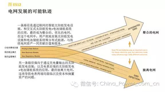 電力系統(tǒng)正處于發(fā)展道路上的一個交叉路口。一條路徑是有利于無電量輸出的太陽能發(fā)電設施以及太陽能發(fā)電+電池儲能系統(tǒng)的定價結構、商業(yè)模式和監(jiān)管環(huán)境。當經(jīng)濟條件和其它條件達到臨界點時,這一軌跡的結果將會是大量用戶脫離大電網(wǎng)。與此同時,隨著擱置電網(wǎng)資產(chǎn)服務的負荷將越來越少,電網(wǎng)供應電價將面臨螺旋式上升,這會使得太陽能+儲能系統(tǒng)對用戶更具吸引力,從而導致剩余的聯(lián)網(wǎng)用戶的電價水平不可避免的進一步升高,形成惡性循環(huán)。這些聯(lián)網(wǎng)用戶包括低收入和固定收入的用戶,他們將承擔因零售電力定價上漲而帶來的比例失調的負擔。在這一情景下,電網(wǎng)和用戶側資源都面臨過度建造但利用程度過低的問題,使得電表兩端的資金過剩。另一條路徑則會建立相應的定價結構、商業(yè)模式和監(jiān)管環(huán)境,使得太陽能發(fā)電設施和電池儲能系統(tǒng)等分布式能源,(及其內(nèi)在收益和成本)都被恰當?shù)匾暈檎虾蟮碾娋W(wǎng)的有機組成部分。太陽能發(fā)電設施和電池儲能系統(tǒng)能潛在地降低整個系統(tǒng)的成本,同時對未來建立可靠的、彈性的、支付得起的低碳電網(wǎng)做出貢獻,在這個電網(wǎng)系統(tǒng)里,用戶有權選擇。在這一情景下,電網(wǎng)和用戶側資源作為整合的電網(wǎng)的有機組成部分相輔相成,資金和實體資產(chǎn)的運用效率更高。