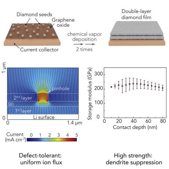 納米金剛石薄膜不僅具有優(yōu)異的電化穩(wěn)定性,而且具有抑制鋰枝晶的極高模量。由于表面保護(hù)層的針孔會(huì)破壞離子流量的均勻性,斯坦福研究人員開(kāi)發(fā)出了獨(dú)特的雙層結(jié)構(gòu)來(lái)彌補(bǔ)設(shè)計(jì)缺陷,也就是,一層中的缺陷可通過(guò)另一完整層來(lái)篩誤。