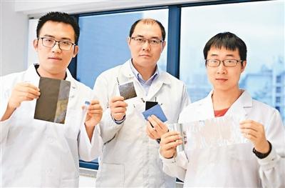 香港城市大學(xué)副教授支春義(中)帶領(lǐng)李洪飛(左)、唐子杰(右)等博士生研究出一種水系鋅電池。圖為三人分別手持封裝后的鋅電池以及用來制造兩個(gè)電極的二氧化錳材料和鋅片。