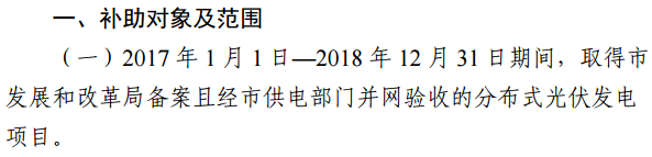 對(duì)機(jī)關(guān)事業(yè)單位、工業(yè)、農(nóng)業(yè)、交通站場(chǎng)、商業(yè)、學(xué)校、醫(yī)院、社區(qū)等非自有住宅建設(shè)分布式光伏發(fā)電項(xiàng)目的各類(lèi)投資者,按實(shí)際發(fā)電量補(bǔ)助0.1元/千瓦時(shí),補(bǔ)助時(shí)間自補(bǔ)助申請(qǐng)批準(zhǔn)后的次月起,連續(xù)5年進(jìn)行補(bǔ)助。