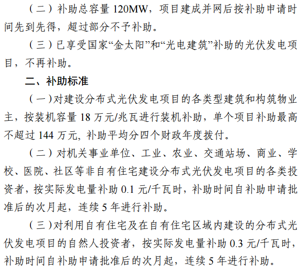 此外,對(duì)建設(shè)分布式光伏發(fā)電項(xiàng)目的各類(lèi)型建筑和構(gòu)筑物業(yè)主,按裝機(jī)容量18萬(wàn)元/兆瓦進(jìn)行裝機(jī)補(bǔ)助,單個(gè)項(xiàng)目補(bǔ)助最高不超過(guò)144萬(wàn)元,補(bǔ)助平均分四個(gè)財(cái)政年度撥付。