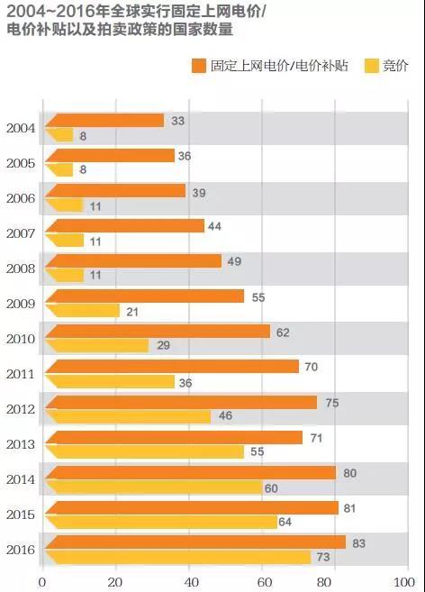 在所有的政策類型之中,采用固定電價(jià)(或上網(wǎng)電價(jià)補(bǔ)貼)與拍賣機(jī)制的國家數(shù)量最多,到2016年分別達(dá)到了83個(gè)和73個(gè)。