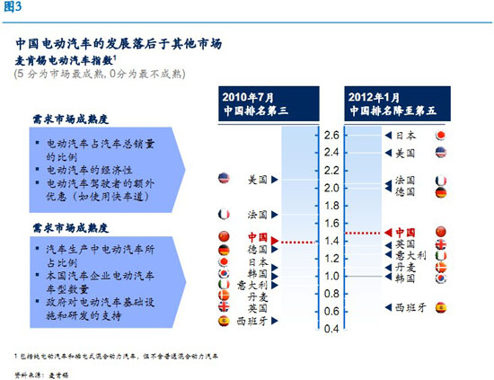 麥肯錫的電動(dòng)汽車指數(shù)可以被用來(lái)衡量一個(gè)國(guó)家是否有足夠準(zhǔn)備支持電動(dòng)汽車產(chǎn)業(yè)。該指數(shù)從供給和需求角度對(duì)一個(gè)國(guó)家的電動(dòng)汽車成熟度進(jìn)行評(píng)估:根據(jù)本國(guó)汽車廠商規(guī)劃的電動(dòng)汽車產(chǎn)量等指標(biāo)進(jìn)行供給衡量,根據(jù)對(duì)車主提供的優(yōu)惠措施和基礎(chǔ)設(shè)施投資水平等指標(biāo)進(jìn)行需求衡量。麥肯錫的電動(dòng)汽車指數(shù)表明中國(guó)在供給和需求的得分都相對(duì)較低。而且中國(guó)電動(dòng)汽車整體成熟度從2010年7月的第三位降至2012年2月的第五位,排在日本、美國(guó)、法國(guó)和德國(guó)之后(圖3)。