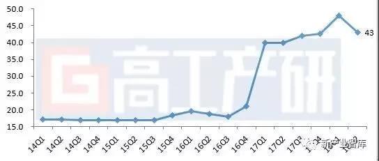 2014Q1-2018Q2中國(guó)4.35V鈷酸鋰的均價(jià)(萬(wàn)元/噸)