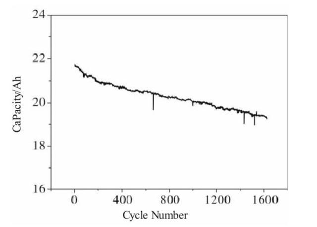 磷酸鐵鋰電池的特點(diǎn)在于安全性高,高倍率充放電特性和較長(zhǎng)的循環(huán)壽命。文獻(xiàn)顯示,在充電條件為1C倍率充電至3.65V,然后轉(zhuǎn)恒壓至電流下降到0.02C,之后以1C倍率放電至截止電壓2.0V,循環(huán)1600次之后電池容量仍有初始容量的80%。