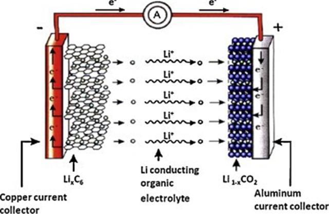 充電時(shí)鋰離子從正極材料的晶格中脫出經(jīng)過(guò)電解質(zhì)嵌入到負(fù)極材料層中;放電時(shí)鋰離子從負(fù)極材料晶格中脫出,經(jīng)過(guò)電解質(zhì)嵌入到正極材料中。而電子則通過(guò)外電路,形成電流。