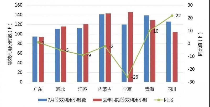 由以上圖表可以看出,2018年7月,除廣東、青海和四川外,其他省份的利用小時(shí)數(shù)均較去年同期低。四川省的平均等效利用小時(shí)數(shù)較去年同期同比增加22小時(shí),寧夏省的平均等效利用小時(shí)數(shù)較去年同期同比減少26小時(shí)。
