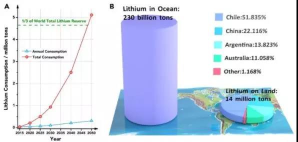 圖1:(A)鋰資源在2015~2050年間的預期年消耗量和總消耗量曲線;(B)海洋和陸地中鋰資源儲量對比圖,陸地上鋰資源分布不均,主要分布在智利、中國、阿根廷和澳大利亞。