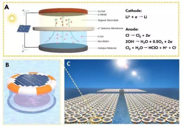 圖2:(A)太負能驅動的電解法海水提鋰裝置原理示意圖;(B)裝置單體示意圖,自上而下分別為太負能板、有機電解液正極區(qū)、陶瓷選擇性膜、海水負極區(qū),整個裝置可以利用橡皮圈浮于海面;(C)海上大量裝置排列的假想圖。