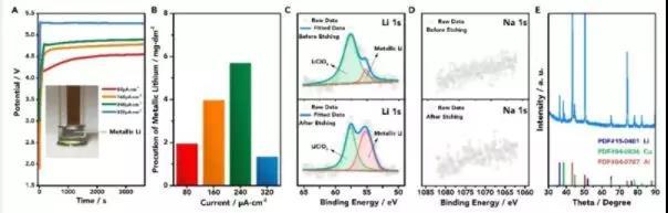 圖3:(A)在80、160、240和320μA·cm-2電流密度下的電位-時間曲線(插圖為在80μA·cm-2電流密度下電解1h的電極照片);(B)每平方厘米銅片上的金屬鋰產量;(C)沉積產物在氬離子刻蝕前后Li的XPS表征圖;(D)正極沉積產物在氬離子刻蝕前后Li和Na的XPS表征圖;(E)沉積產物的XRD表征圖(Al峰來自于氣氛保護裝置的樣品臺)