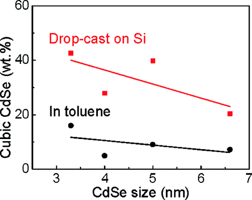 硒化鎘量子點(diǎn)的結(jié)構(gòu)和電子性質(zhì)的研究,采用原位微X射線衍射,X射線光電子能譜,紫外-可見光吸收和發(fā)射光譜。原位微衍射數(shù)據(jù)表明,硒化鎘量子點(diǎn)配位,是采用三辛基氧化(TOPO:trioctylphosphine oxide)或十六烷基(HADA:hexadecylamine),在甲苯(toluene)中的呈現(xiàn)主要是纖鋅礦(wurtzite)晶體結(jié)構(gòu),經(jīng)過相變,成為閃鋅礦(zinc blende)晶體結(jié)構(gòu),之后澆鑄在硅上。而且,減少硒化鎘量子點(diǎn)的尺寸,會(huì)促進(jìn)相變。X射線光電子能譜顯示,系統(tǒng)地增加核心層結(jié)合能,結(jié)合三維鎘和三維硒以及帶隙,需要縮小硒化鎘量子點(diǎn)的尺寸,會(huì)表現(xiàn)出量子限制。此外,鎘/硒的比例會(huì)增加,因?yàn)榱孔狱c(diǎn)的尺寸會(huì)從6.6納米降低到2.1納米,這就會(huì)增加硒的空位,從而引起相變。把硒化鎘量子點(diǎn)澆鑄在硅上,會(huì)改變配位基(capping ligands)的排列,這會(huì)顯著促進(jìn)更多的相變。