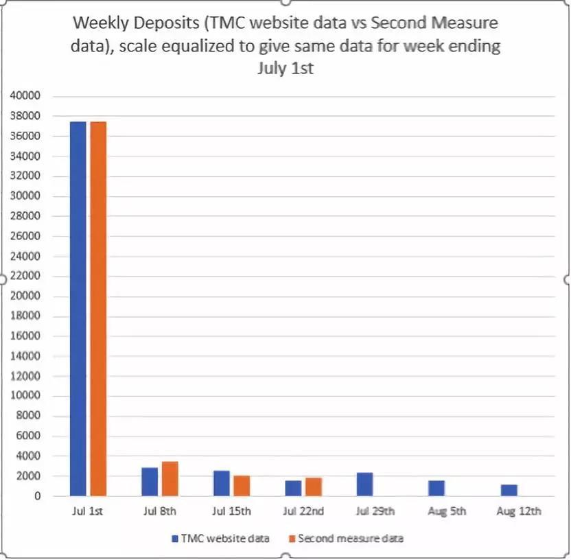 特斯拉汽車俱樂部(Tesla Motors Club,下稱“TMC”)網站上的Model 3訂單跟蹤表(Model 3 Order Tracker spreadsheet),按日期跟蹤新配置的車輛。在下面的圖表中,我將Second Measure數(shù)據與TMC表格的數(shù)據進行了比較。