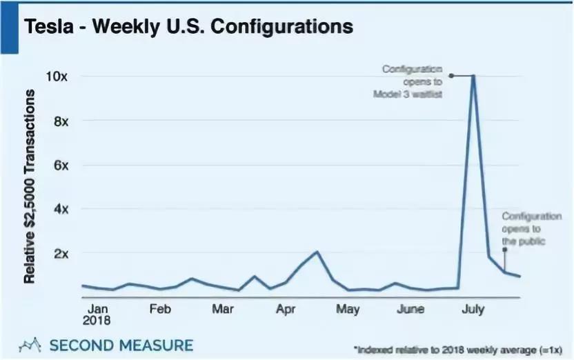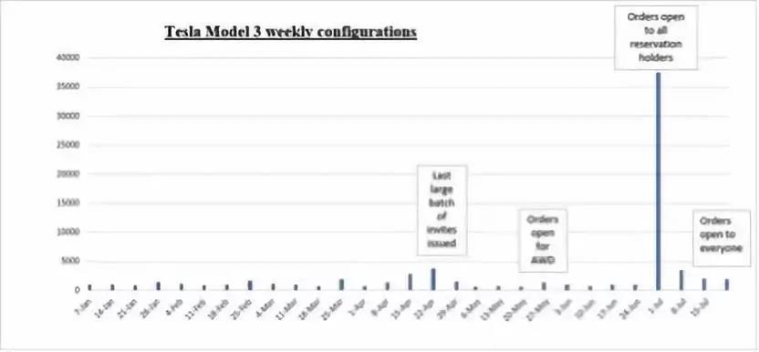 1.當特斯拉對所有Model3預訂用戶開放選配時,訂單數(shù)量出現(xiàn)了暫時的大幅增長。