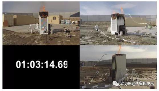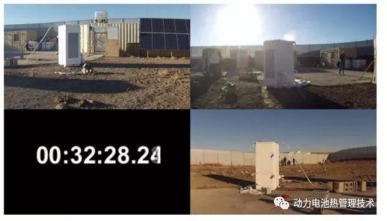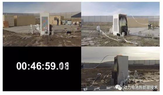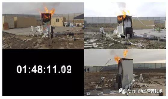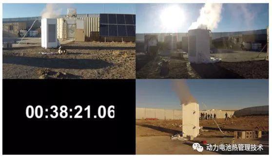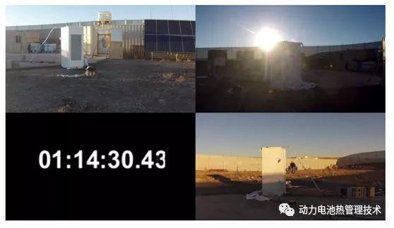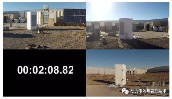 閑話少說,直接看實驗過程,儲能系統(tǒng)布置在空曠的室外,采用兩個100KWh的儲能單元,實驗前電池處于滿電態(tài),分別對電池進(jìn)行外部及內(nèi)部加熱,觸發(fā)電池?zé)崾Э兀蛊浒l(fā)生燃燒甚至爆炸。