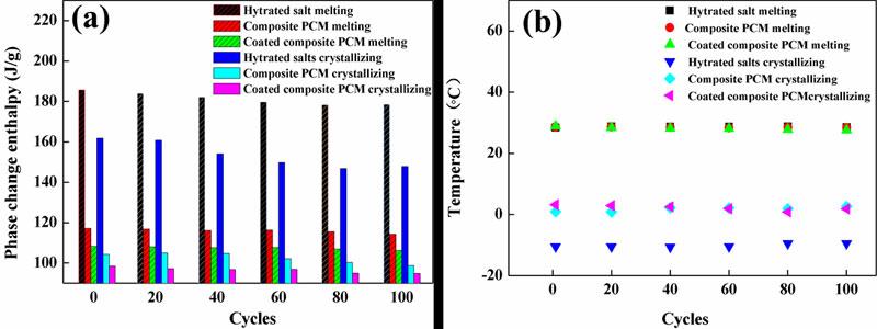 六水氯化鈣、復(fù)合材料和包覆的復(fù)合材料在循環(huán)中焓值變化 (a)相變焓值 (b)相變溫度