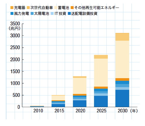 電動車產(chǎn)業(yè)(次世代自動車)雖然消耗電池的數(shù)量甚高,但是在基礎建設尚未成熟且周邊延伸產(chǎn)業(yè)尚未成形之際,于近五年內仍舊難以大規(guī)模普及;反觀儲能電池(蓄電池)產(chǎn)業(yè)除可搭配著再生能源做應用,也可單獨使用作為緊急備用電力系統(tǒng),未來的市場需求可期。根據(jù)日本METI預估(圖一),全球儲能系統(tǒng)需求將隨著智能城市的興起而成長,以日本市場而言,因為災害所促成的城鎮(zhèn)再造機會,將更加速落實新型態(tài)能源應用的進程,預估將在2012年開始在日本市場會有明顯的成長需求,未來五年更會快速擴展至全球各主要城鎮(zhèn)地區(qū)。