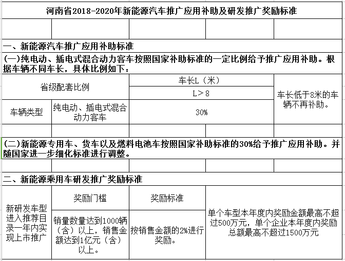 6月5日,河南省財(cái)政廳發(fā)布關(guān)于公開征求《關(guān)于調(diào)整河南省新能源汽車推廣應(yīng)用及充電基礎(chǔ)設(shè)施獎補(bǔ)政策的通知》有關(guān)意見的通知,省財(cái)政依據(jù)2018年國家補(bǔ)助標(biāo)準(zhǔn)按不同比例進(jìn)行補(bǔ)助。省級和市縣補(bǔ)助金額不超過中央財(cái)政單車補(bǔ)貼額的50%。如市縣出臺補(bǔ)助政策超過中央單車補(bǔ)貼額的20%,則省財(cái)政僅補(bǔ)助中央單車補(bǔ)貼額50%扣除市縣補(bǔ)助比例后剩余比例。