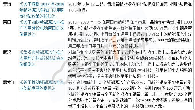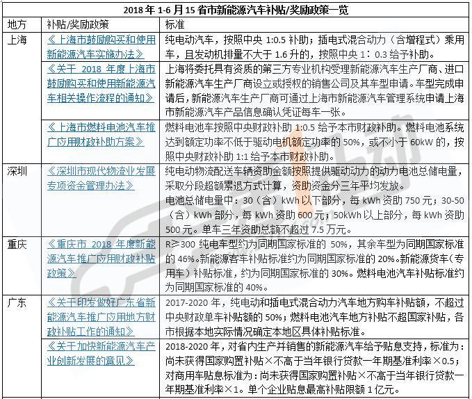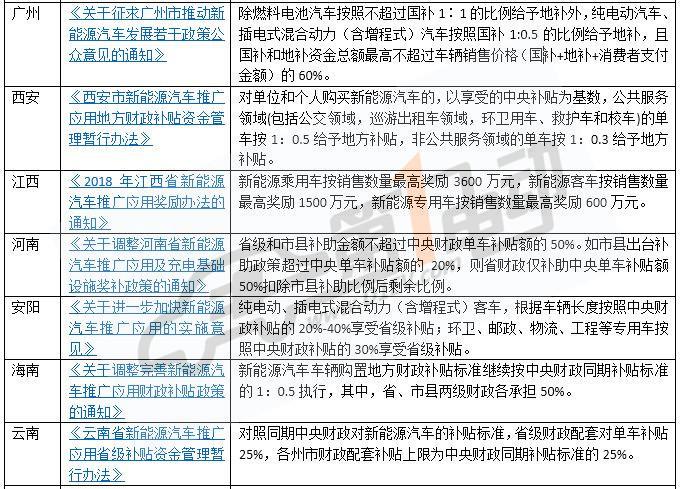 補(bǔ)貼標(biāo)準(zhǔn)方面,廣東、廣州、河南、海南、云南、青海新能源汽車均按中央標(biāo)準(zhǔn)1:0.5補(bǔ)助。上海插電式混動車按中央1:0.3給予補(bǔ)助,純電動和燃料電池車按中央1:0.5補(bǔ)助。西安非公共服務(wù)領(lǐng)域的單車按中央1:0.3補(bǔ)貼,公共領(lǐng)域按中央標(biāo)準(zhǔn)1:0.5補(bǔ)助。武漢按新能源汽車軸距大小給予50%和20%補(bǔ)貼。深圳僅出臺了純電動物流車補(bǔ)貼標(biāo)準(zhǔn)。江西、福建莆田和黑龍江出臺了新能源汽車獎勵政策。