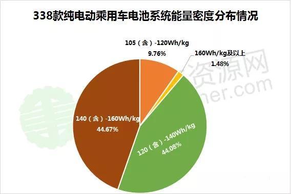 2018年新能源汽車補貼政策還表示,純電動乘用車動力電池系統(tǒng)的質(zhì)量能量密度不低于105Wh/kg,105(含)-120Wh/kg的車型按0.6倍補貼,120(含)-140Wh/kg的車型按1倍補貼,140(含)-160Wh/kg的車型按1.1倍補貼,160Wh/kg及以上的車型按1.2倍補貼。經(jīng)電動汽車資源網(wǎng)梳理,入圍5、6推薦目錄的340款純電動乘用車中有兩款車型搭載的動力電池能量密度跨越兩個區(qū)間,其余338款純電動乘用車中電池系統(tǒng)能量密度在105(含)-120Wh/kg的車型33款,占比9.76%;120(含)-140Wh/kg的車型有149款,占比44.08%;140(含)-160Wh/kg的車型有151款,占比44.67%;160Wh/kg及以上的車型有5款,占比1.48%。也就是說有46.15%的車型有望獲得1.1倍以上補貼。其中動力電池能量密度最高的車型由河南鋰動電源有限公司提供配套,電池系統(tǒng)能量密度為165.45Wh/kg,車輛工況續(xù)航為405km。
