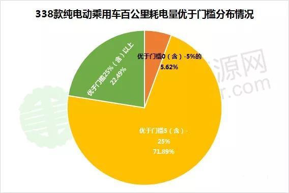 此外,2018年新能源汽車補貼政策表示,按整車整備質(zhì)量(m)不同,工況條件下百公里耗電量(Y)應(yīng)滿足以下門檻條件:m≤1000kg時,Y≤0.0126×m+0.45;1000<m≤1600kg時, Y≤0.0108×m+2.25;m>1600kg時,Y≤0.0045×m+12.33。百公里耗電量(Y)優(yōu)于門檻0(含)-5%的車型按0.5倍補貼,優(yōu)于門檻5(含)-25%的車型按1倍補貼,優(yōu)于門檻25%(含)以上的車型按1.1倍補貼。經(jīng)電動汽車資源網(wǎng)測算,有兩款車型百公里耗電量跨越兩個區(qū)間,其余368款車型中優(yōu)于門檻0(含)-5%的車型有19款,占比5.62%;優(yōu)于門檻5(含)-25%的車型有243款,占比71.89%;優(yōu)于門檻25%(含)以上的車型有76款,占比22.49%。