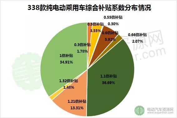 根據(jù)2018年新能源汽車補貼新政,新能源乘用車單車補貼金額=里程補貼標準×電池系統(tǒng)能量密度調(diào)整系數(shù)×車輛能耗調(diào)整系數(shù)。根據(jù)以上梳理的信息,綜合來看,除了兩款車型跨越兩個補貼調(diào)整系數(shù)區(qū)間外,其余的338款純電動乘用車中,按里程補貼標準0.3倍補貼的車型有6款,占比1.78%;0.5倍補貼的車型有12款,占比3.55%;0.55倍補貼的車型有1款,占比0.30%;0.6倍補貼的車型有20款,占比5.92%;0.66倍補貼的車型有7款,占比2.07%;1倍補貼的車型有118款,占比34.91%;1.1倍補貼的車型有124款,占比36.69%;1.21倍補貼的車型有45款,占比13.13%;1.32倍補貼的車型有5款,占比1.48%。也就是說有51.48%車型可獲得1.1倍以上補貼。