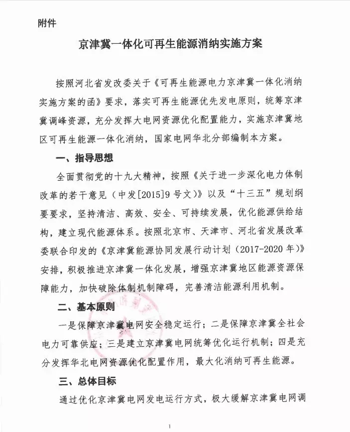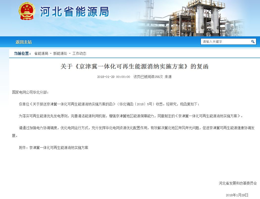 為貫徹落實《京津冀協(xié)同發(fā)展規(guī)劃綱要》,在2017年11月15日的采暖季開始之前,北京、天津和河北三地發(fā)改委就聯(lián)合印發(fā)了《京津冀能源協(xié)同發(fā)展行動計劃(2017-2020年)》(以下簡稱行動計劃)。行動計劃提出,未來將推進可再生能源發(fā)展,大力發(fā)展風(fēng)電、光電,推進風(fēng)電基地建設(shè)。打造張家口可再生能源示范區(qū),建設(shè)崇禮低碳奧運專區(qū)。規(guī)劃建設(shè)能源高端應(yīng)用示范區(qū),鼓勵多能互補、智能融合的能源利用新模式。此外,還將促進可再生能源消納,優(yōu)先安排張家口可再生能源示范區(qū)等可再生能源和清潔能源上網(wǎng),實現(xiàn)在京津冀區(qū)域一體化消納。