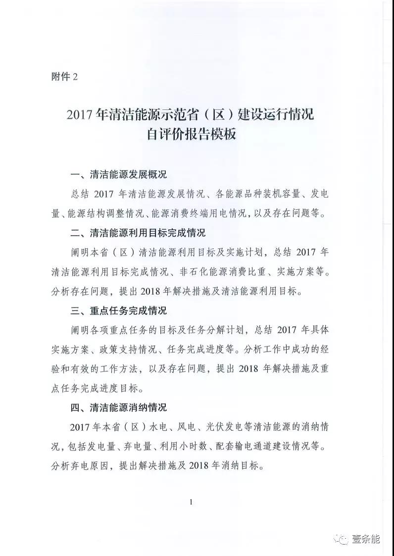 四、開展2017年清潔能源示范?。▍^(qū))評價工作。各有關(guān)?。▍^(qū))能源主管部門在2018年3月1日前提交2017年建設(shè)運行情況自評價報告。2017年清潔能源示范省(區(qū))建設(shè)運行情況自評價報告模板見附件2。