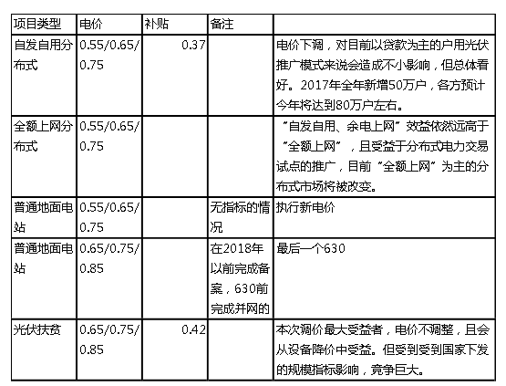 總體來看,電價(jià)調(diào)整之后,“自發(fā)自用、余電上網(wǎng)”的分布式光伏項(xiàng)目,盡管補(bǔ)貼下調(diào)0.05元/kWh,與大型地面電站相比,仍具有較高的投資收益。而“全額上網(wǎng)”項(xiàng)目盡管執(zhí)行光伏電站標(biāo)桿上網(wǎng)電價(jià),但由于不受規(guī)模管理限制,也有較大發(fā)展空間。因此,2018年分布式光伏預(yù)計(jì)仍有大發(fā)展。