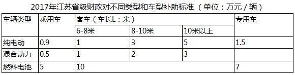 2017年,新能源客車車輛購置補(bǔ)貼標(biāo)準(zhǔn)為中央財(cái)政相應(yīng)車型單車補(bǔ)貼額的30%;新能源乘用車、專用車(貨車)、燃料電池汽車車輛購置補(bǔ)貼標(biāo)準(zhǔn)為中央財(cái)政相應(yīng)車型單車補(bǔ)貼額的40%。地方財(cái)政補(bǔ)貼總額最高不超過扣除國家補(bǔ)貼后汽車售價(jià)的60%(以銷售發(fā)票為準(zhǔn))。