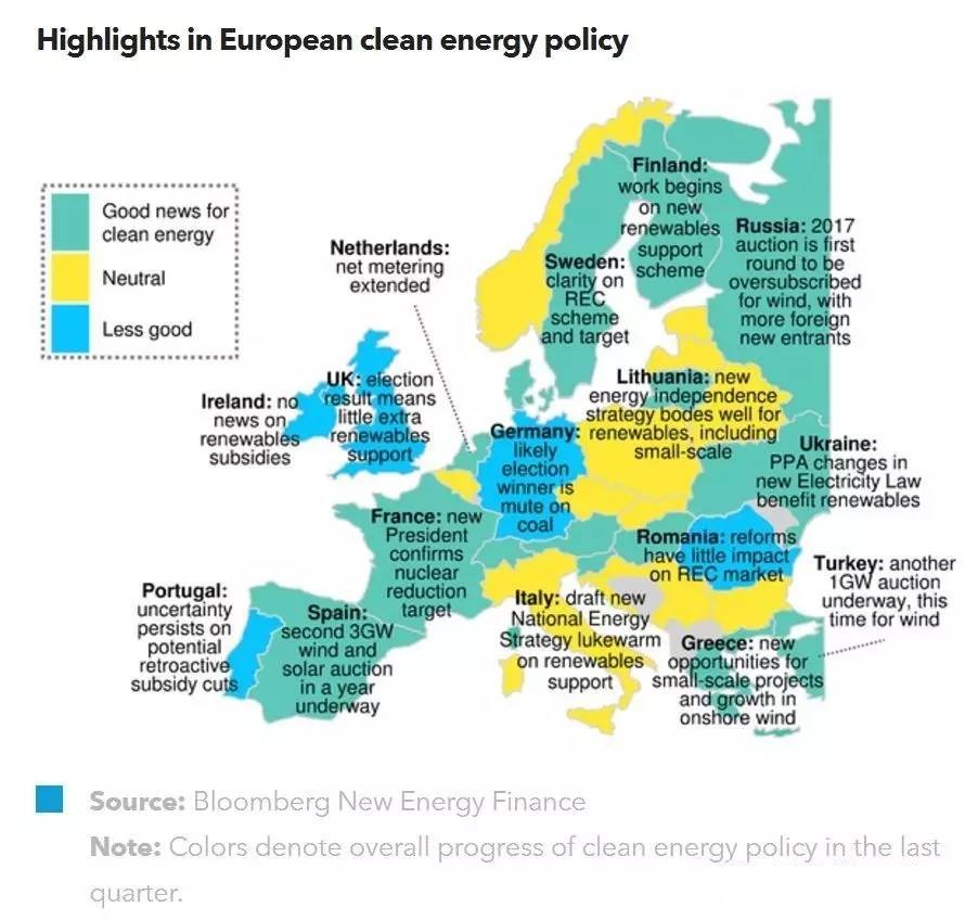 中國儲能網(wǎng)訊:歐盟政府意圖削減可再生能源項目補(bǔ)貼的態(tài)度使歐洲近期可再生能源項目招標(biāo)數(shù)量激增 - 相比去年的5GW, 2017年上半年的總招標(biāo)容量達(dá)14GW。在2017年第二季度可再生能源項目政府補(bǔ)貼同比下降49%之后,出現(xiàn)這一招標(biāo)結(jié)果對整個歐洲地區(qū)可再生能源項目的投資而言,絕對是個利好消息。歐洲大部分國家出臺的政策都是積極支持可再生能源發(fā)電發(fā)展的。在本歐洲電力政策展望報告所研究的32個國家中,2017年第二季度支持政策力度減弱的國家有8個,而本季度僅有4個國家面臨這一狀況。