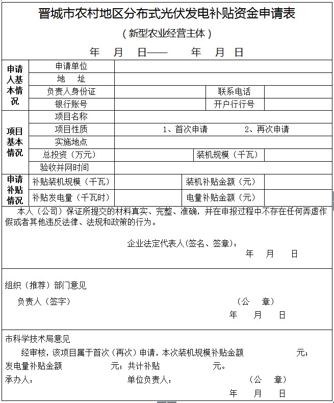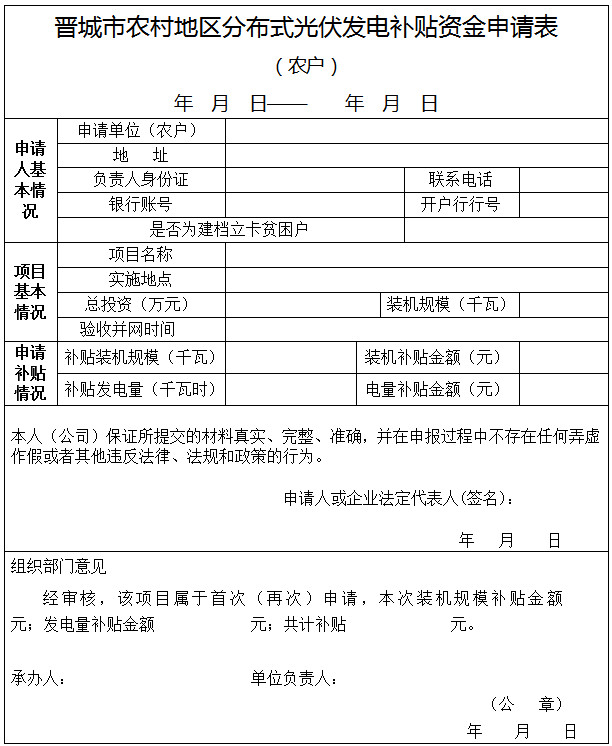1、《晉城市農(nóng)村地區(qū)分布式光伏發(fā)電補(bǔ)貼資金申請(qǐng)表》。