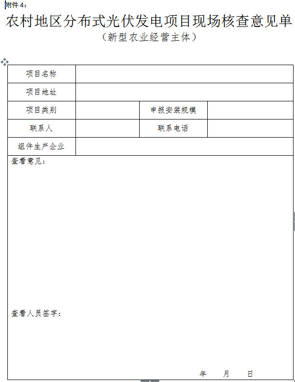 附件4:《農(nóng)村地區(qū)分布式光伏發(fā)電項(xiàng)目現(xiàn)場(chǎng)核查意見(jiàn)單(新型農(nóng)業(yè)經(jīng)營(yíng)主體)》