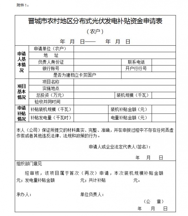 附件1:《晉城市農村地區(qū)分布式光伏發(fā)電補貼資金申請表(農戶)》(詳見配圖)