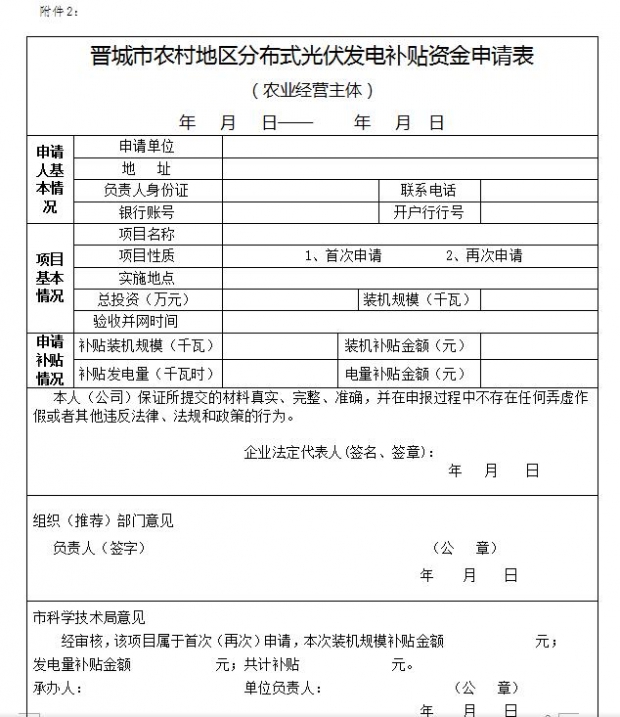 (一)《晉城市農村地區(qū)分布式光伏發(fā)電補貼資金申請表》;