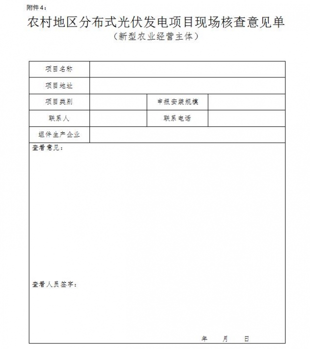 附件4:《農村地區(qū)分布式光伏發(fā)電項目現(xiàn)場核查意見單(新型農業(yè)經營主體)》(詳見配圖)