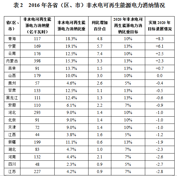 2016年,全國(guó)非水電可再生能源電力消納量為3717億千瓦時(shí),占全社會(huì)用電量比重為6.3%,同比上升1.3個(gè)百分點(diǎn)。綜合考慮各?。▍^(qū)、市)本地生產(chǎn)、本地利用以及外送電力消納可再生能源電量情況,2016年,各?。▍^(qū)、市)非水電可再生能源電力消納量占本地區(qū)全社會(huì)用電量的比重如表2。