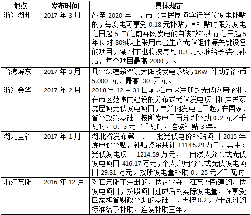 各地關(guān)于光伏補(bǔ)貼的政策文件層出不窮,記者將16年12月至今公開的文件進(jìn)行了匯總,通過整理發(fā)現(xiàn),多數(shù)省份分布式光伏的補(bǔ)貼標(biāo)準(zhǔn)在0.2元—0.3元/kW·h,具體規(guī)定有細(xì)微差別,詳情見下表: