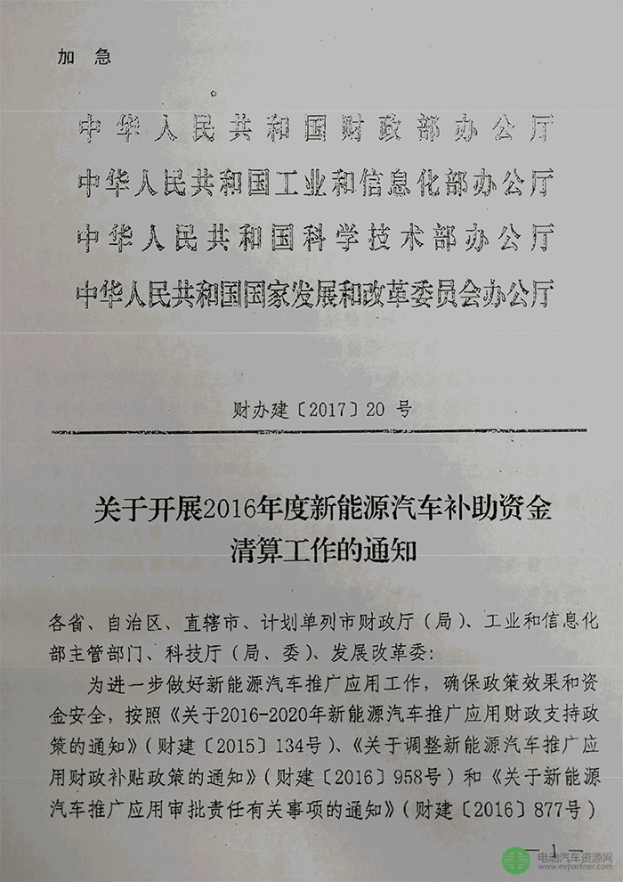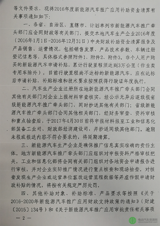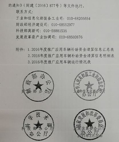 另外,該通知要求,省級新能源汽車推廣牽頭部門會(huì)同其他相關(guān)部門經(jīng)財(cái)務(wù)審查資料審核和重點(diǎn)抽查后,于2017年4月30日前將申報(bào)材料報(bào)至工業(yè)和信息化部裝備工業(yè)司、財(cái)政部經(jīng)濟(jì)建設(shè)司,并抄送同級其他部門,逾期未報(bào)或報(bào)送內(nèi)容不符合要求的,將延期清算。