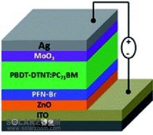 由于在傳統(tǒng)體異質(zhì)結(jié)型聚合物太陽電池采用ITO/PEDOT:PSS/BHJ/Ba(Al)結(jié)構(gòu)中,酸性磺化聚苯(PSS)摻雜的聚噻吩衍生物(PEDOT)對ITO有腐蝕作用,而且銦離子的擴散會影響器件性能。在華南理工大學楊庭斌博士、華南理工大學材料學院黃飛教授、阿克倫大學龔雄助理教授等研究人員的共同努力下,通過采用倒置結(jié)構(gòu),省去了原有的PEDOT:PSS層,可以有效提高電池的穩(wěn)定性。研究人員采用ITO/ZnO/PFN-Br/PBDT-DTNT:PC71BM/MoO2/Ag結(jié)構(gòu)制作電池開路電壓0.75V,短路電流17.4mA/cm2,填充因子61%,轉(zhuǎn)化效率8.4%。