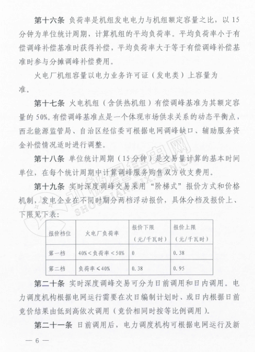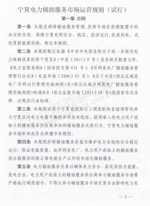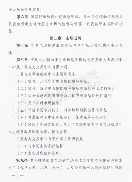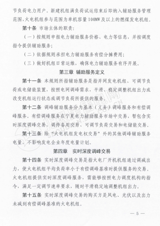 在《寧夏電力輔助服務(wù)市場(chǎng)運(yùn)營(yíng)規(guī)則》中,規(guī)定電力輔助服務(wù)市場(chǎng)的市場(chǎng)主體為寧夏電網(wǎng)統(tǒng)調(diào)并網(wǎng)發(fā)電廠(火電、風(fēng)電、光伏),以及經(jīng)市場(chǎng)準(zhǔn)入的電儲(chǔ)能和可調(diào)節(jié)負(fù)荷電力用戶(hù)。新建機(jī)級(jí)組滿(mǎn)負(fù)荷試運(yùn)結(jié)束后即納入輔助服務(wù)管理范圍,火電機(jī)組參與范圍為單機(jī)容量100MW及以上的燃煤發(fā)電機(jī)組。與前不久剛剛發(fā)布的甘肅的電力輔助服務(wù)運(yùn)營(yíng)規(guī)則中規(guī)定的市場(chǎng)主體相比較,缺少了水電企業(yè)的身影。