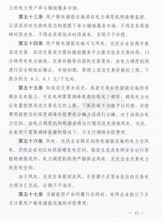 鼓勵(lì)發(fā)電企業(yè)、售電企業(yè)、電力用戶(hù)、獨(dú)立輔助服務(wù)提供商等投資建設(shè)電儲(chǔ)能設(shè)備,要求充電功率在1萬(wàn)千瓦及以上、持續(xù)充電時(shí)間4小時(shí)以上。同樣,電儲(chǔ)能設(shè)施也可與風(fēng)電、光伏企業(yè)協(xié)商開(kāi)展雙邊交易。交易價(jià)格的上限為0.2元/千瓦時(shí),下限0.1元/千瓦時(shí)。