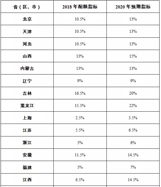 2 、各省級(jí)行政區(qū)域2018、2020年非水電配額指標(biāo)